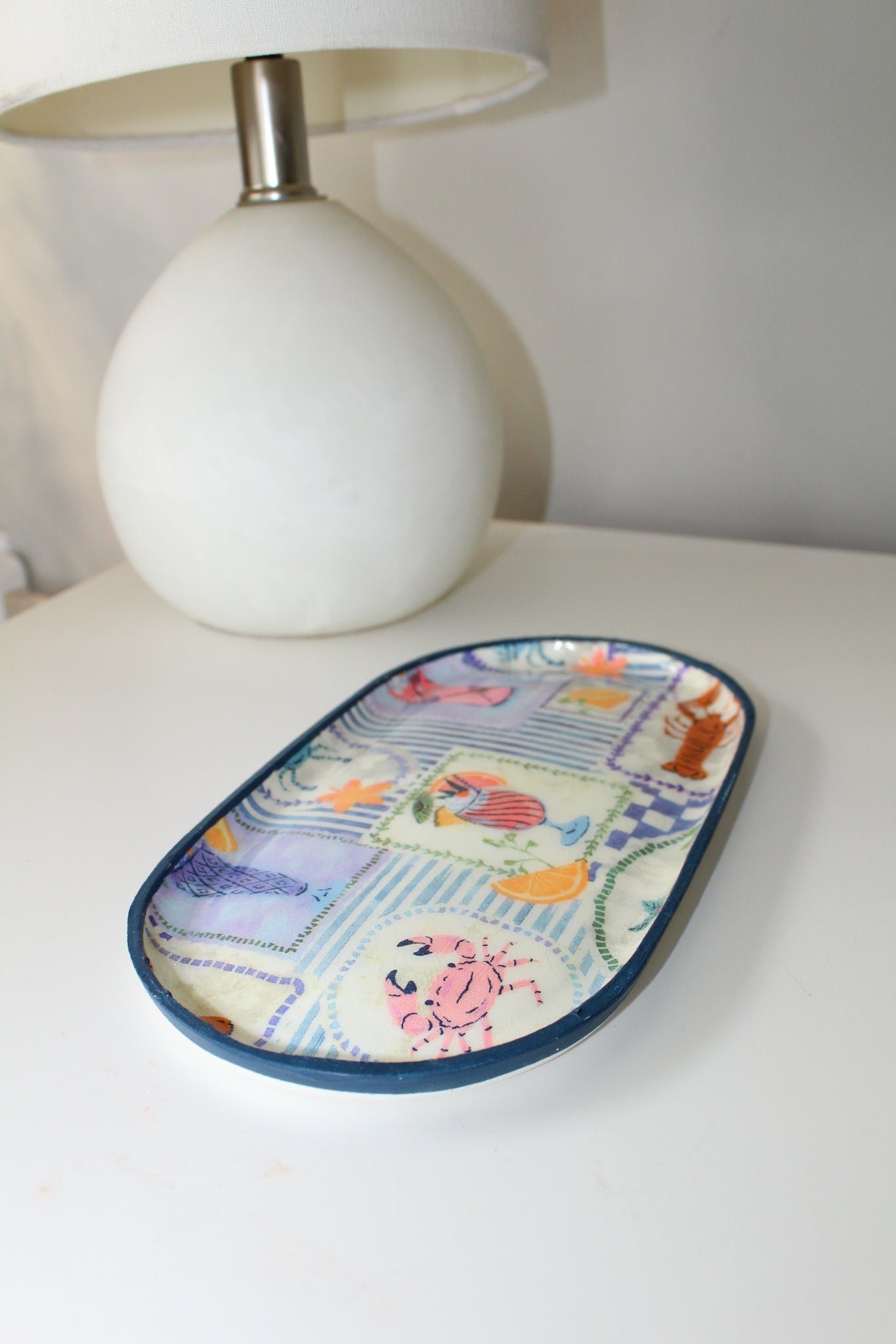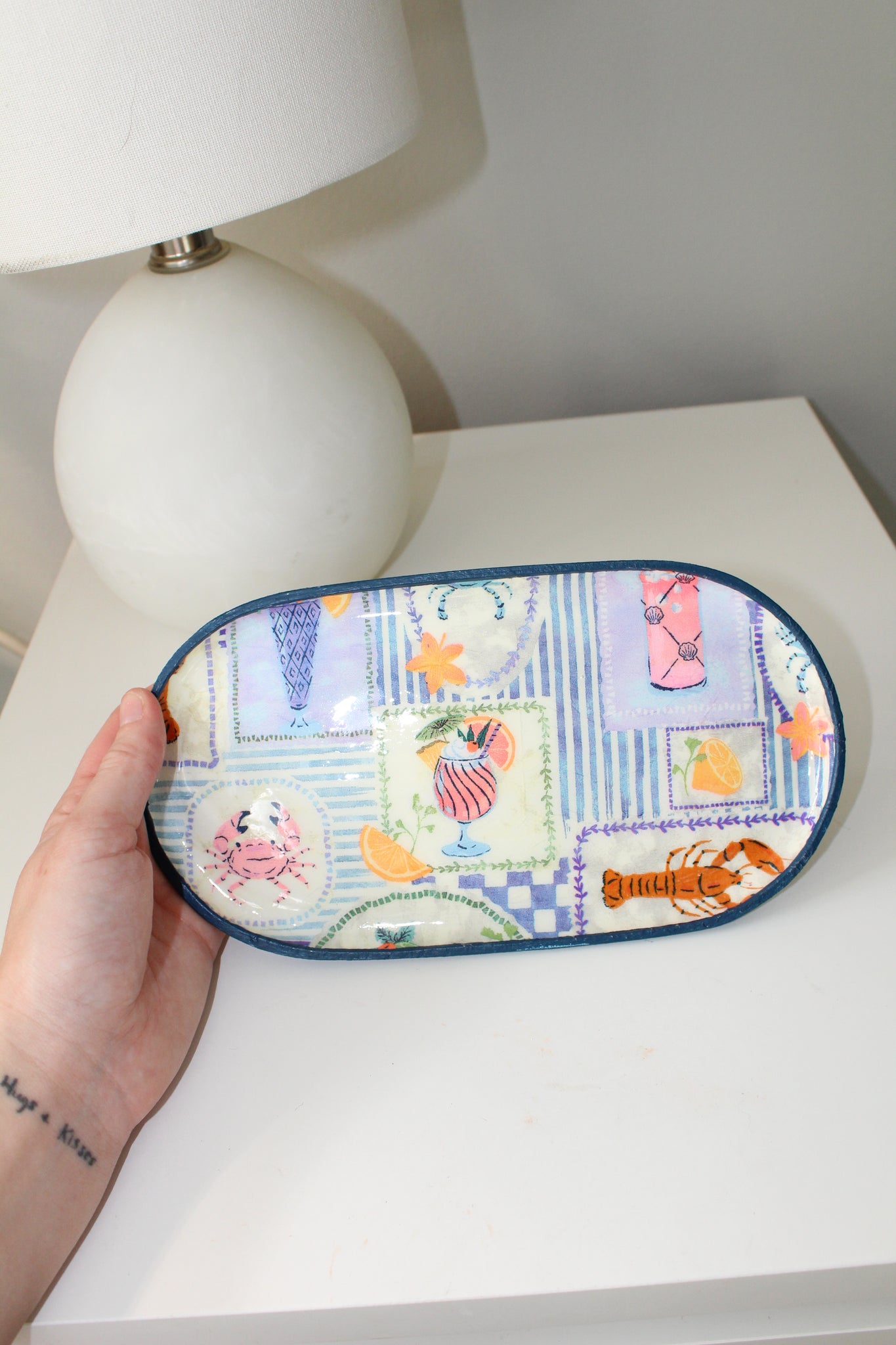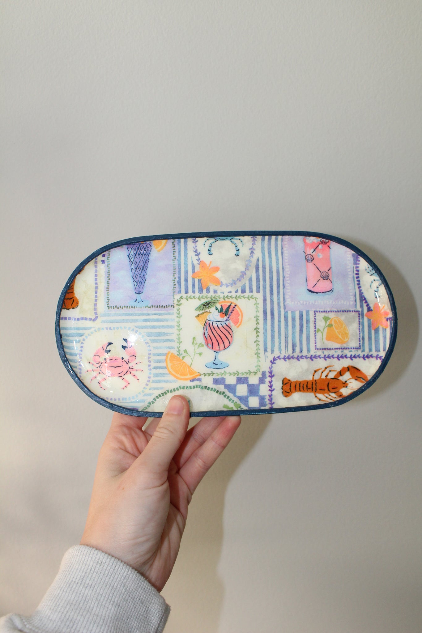 Each dish is crafted from clay and finished with a glossy resin coating for extra durability and shine. The design is sealed beneath the smooth, glass-like surface and framed with a hand-painted edge for a playful, elevated touch. Because every piece is made by hand, no two dishes are exactly alike — that’s part of what makes them special.